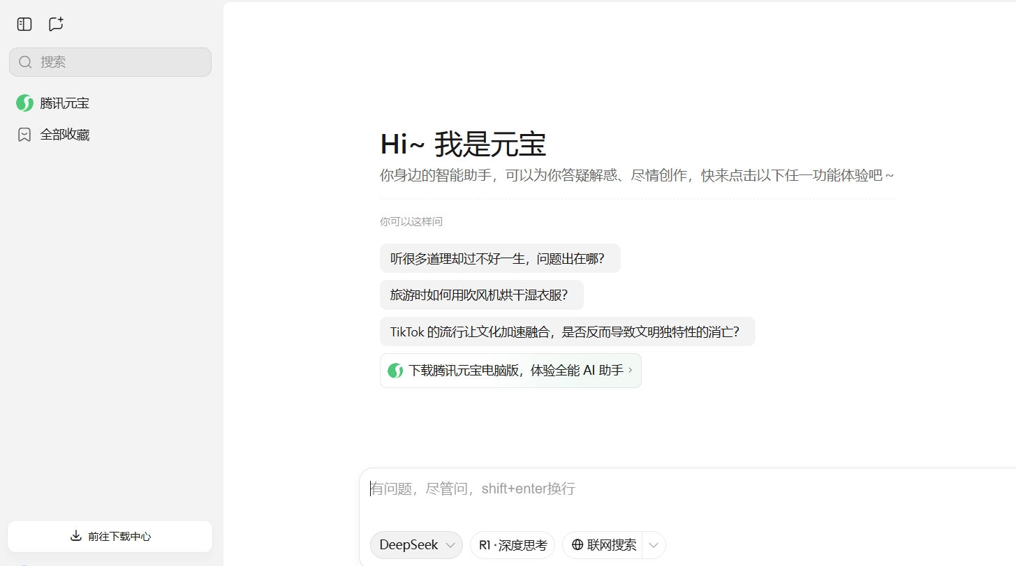 | 🧠 智能对话与搜索 | 双模型智能切换 | 混元模型:适合日常聊天、创意写作,响应速度快。 DeepSeek模型:擅长逻辑推理、代码编程、深度分析,适合处理复杂任务。 |